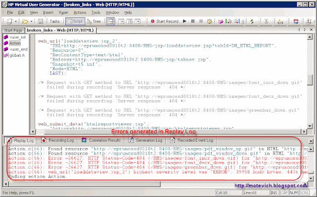 My application had some problems - there were several broken links for images there. So, LoadRunner generated the following script (click the image to view enlarged):As you see, my application had several broken links to images and LoadRunner detected it successfully. Also, you can find the point, where these broken links were used. This is previous function - web_url.